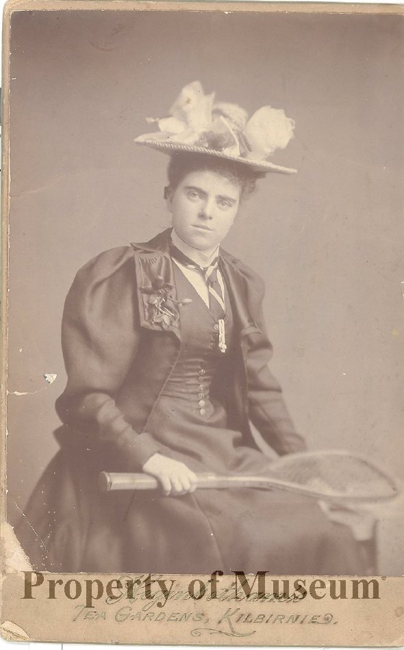 Woman dressed in a "leg of mutton" gown, holding a tennis racquet. Associated with the Small family.