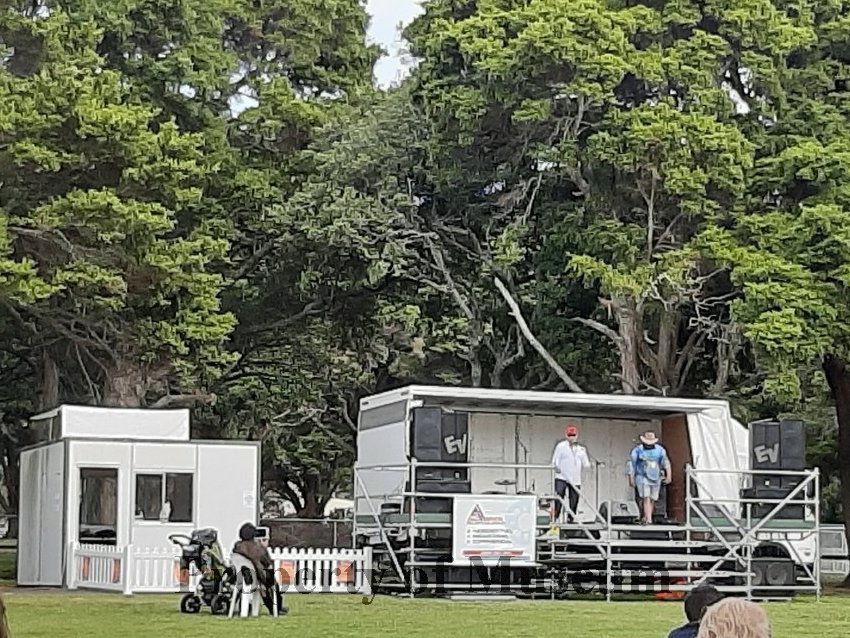 Digital photo of the band 'Iwi' playing at the 'Love Thy Neighbour' concert at Otaki Racecourse, to raise funds for people affected by Australian bushfires.