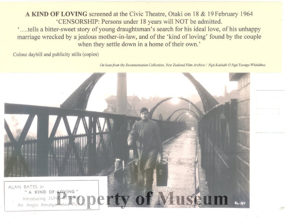 Laminated photo showing Alan Bates in a scene from "A Kind of Loving", screened in the Otaki Civic Theatre February 18 and 19th 1964.