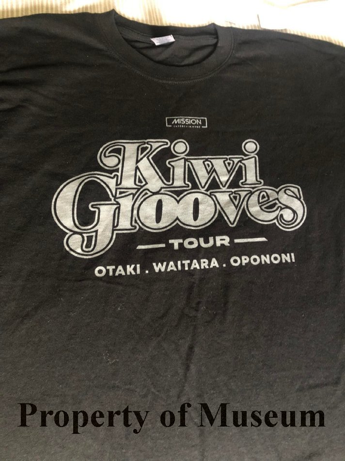 Digital photo of the image on a tee-shirt for the Kiwi Grooves Tour which was held at the Otaki Maori racecourse.