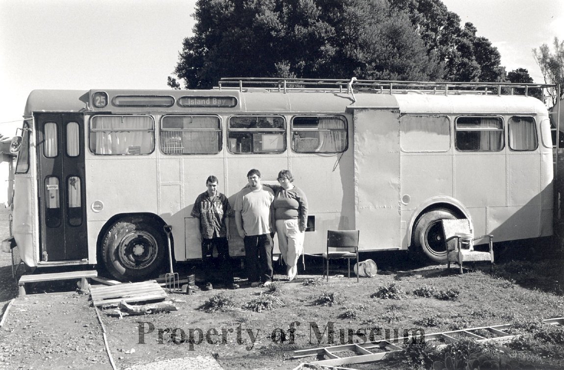 Permanent residents Daniel Jetson, David Ford and Stacey Stevenson outside their house-bus.