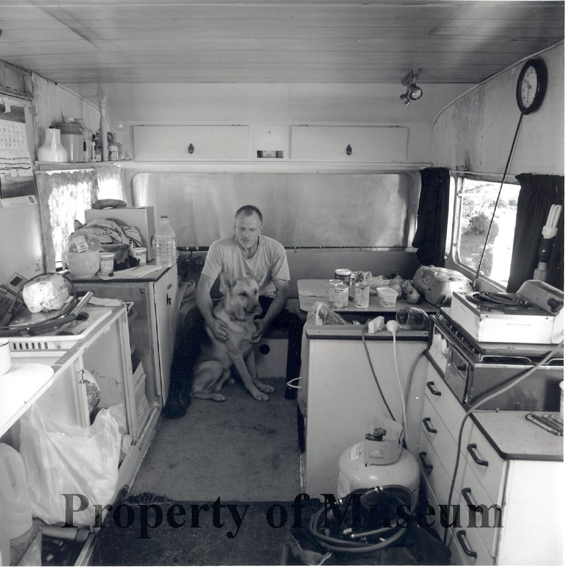 Mike Pilling and his dog in his caravan "Under Tow".