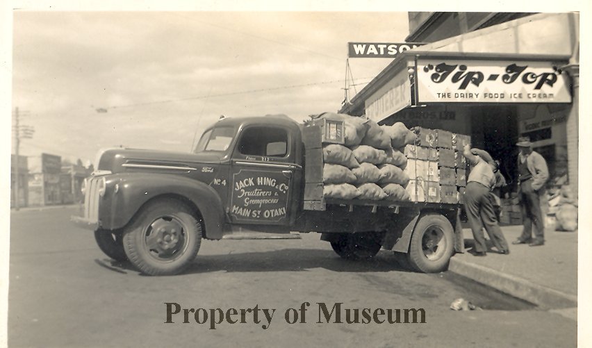 Jackson and Harry Hing unloading vegetables at their father's shop in Rangitikei Street, Palmerston North in the late 1940s.