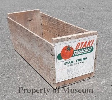 An empty 'Otaki Tomatoes' wooden tomato box with the label of Stan Young's market garden, 263 Mill Rd, Otaki. (1960-1980)