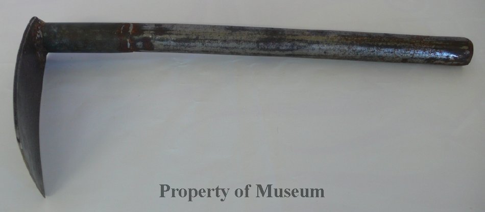 Hand hoe, for planting cabbages and cauliflower. Used by market gardeners Jack Hing & Co at Otaki.