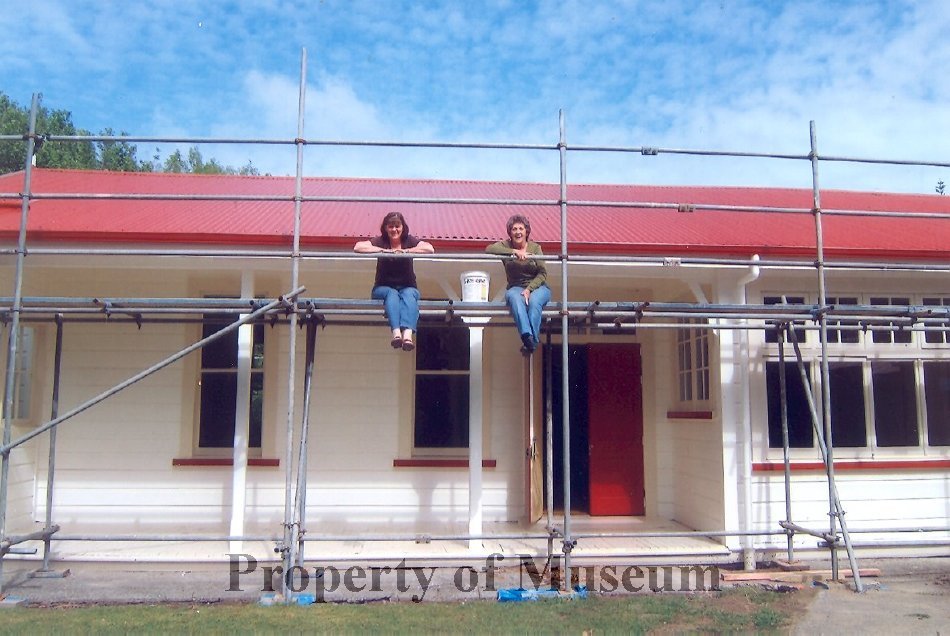 Janet Murray and Michelle Baker (staff) sitting on painters' scaffolding at the Otaki Community Health Centre.