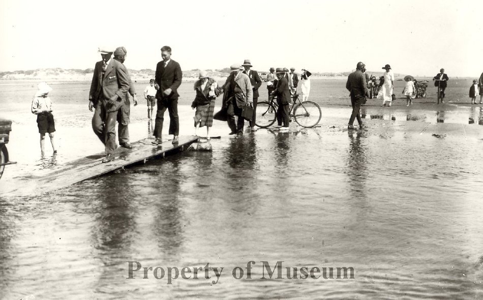 Spectators (possibly for the motorcycle races) crossing the Waitohu River at low tide, Otaki Beach, 1920s.