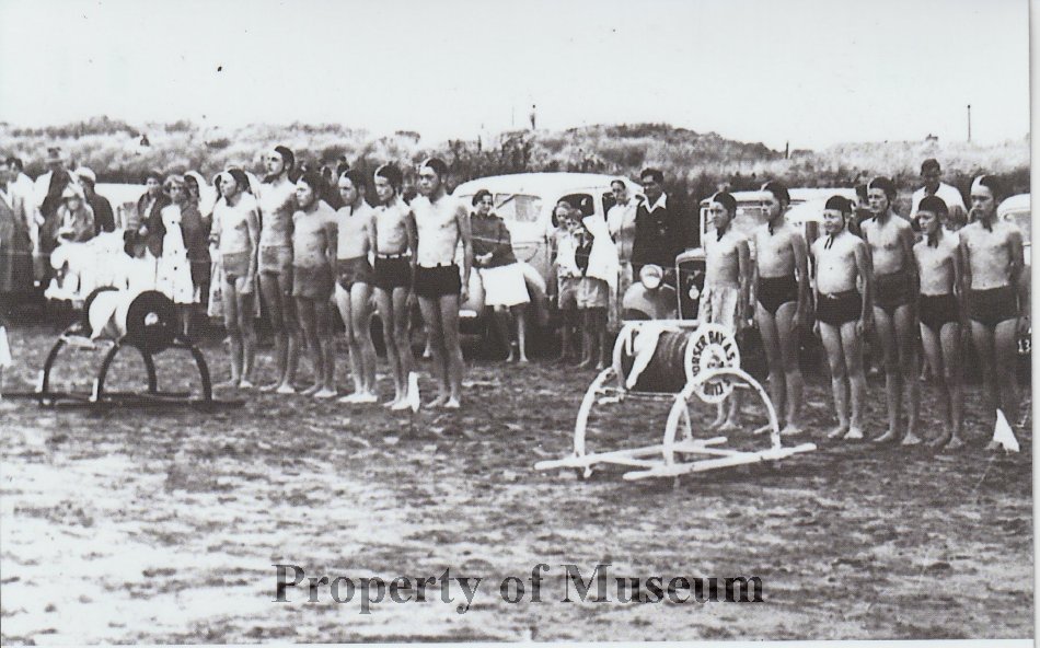 Otaki Surf Lifesaving Club 6-man rescue & resuscitation team, 1950, on the left; Worser Bay team on right.