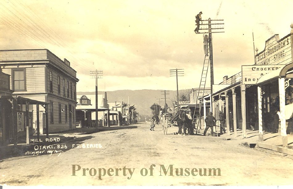 Postcard of Mill Road/Main Street Otaki looking East, with linesmen working on telegraph lines.