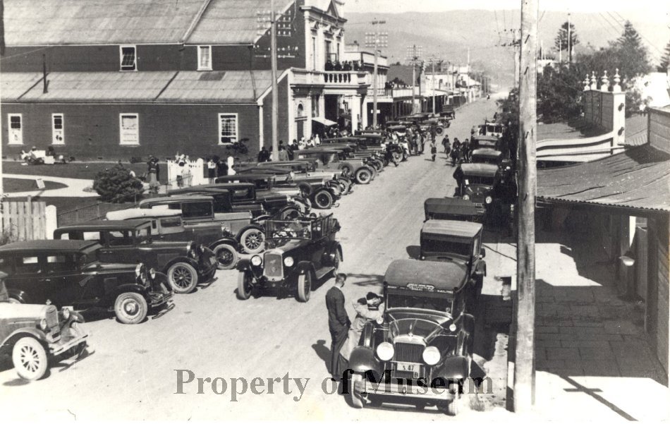 Anzac Day 1932, looking east down Main Street past Centennial Park, Bright's Otaki Theatre and Family Hotel. There are a number of onlookers on the hotel's balcony.