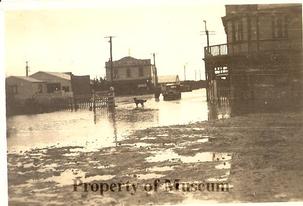 1931 flood at Otaki Railway, looking west along Arthur Street. Railway Hotel on the right. The two storey building (centre distance) is Taylor Bros shop and accommodation on Main Highway.